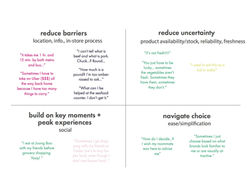 Shadowing, observation, conversation/interview, written documentation + photography. We shadowed and observed our research participants on their journey from home (pre-shopping process) to the grocery store, shopping at the grocery store, and then back home (post-shopping process). We visited both standard American grocery stores and ‘ethnic’ stores (Japanese, Korean, and Indian) with our participants.
